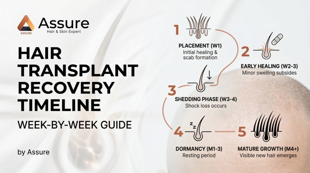 This guide covers the complete hair transplant recovery timeline, based on what our patients at Assure Clinic experience following our UFME and DSHI procedures.